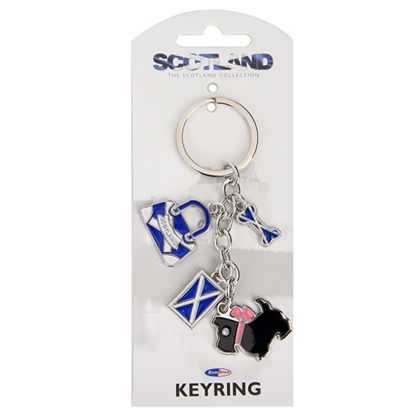 Our Multi Charm keyring includes a black Scottie dog, a Saltire flag, bag and bone to add a little something Scottish to your keys.