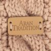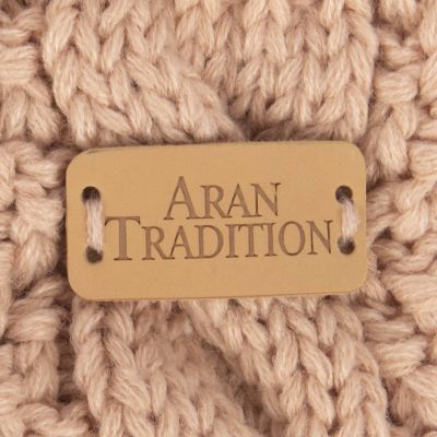 Chunky Cable knit mittens from Aran Traditions. Traditional Aran diamond cable design in soft cosy 3GG knit. Deep 1x1 rib cuff. Pale tan leather brand logo hand stitched on the back of each mitten.