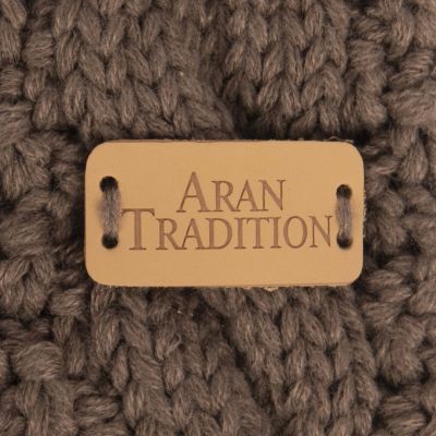 Chunky Cable knit mittens from Aran Traditions. Traditional Aran diamond cable design in soft cosy 3GG knit. Deep 1x1 rib cuff. Pale tan leather brand logo hand stitched on the back of each mitten.