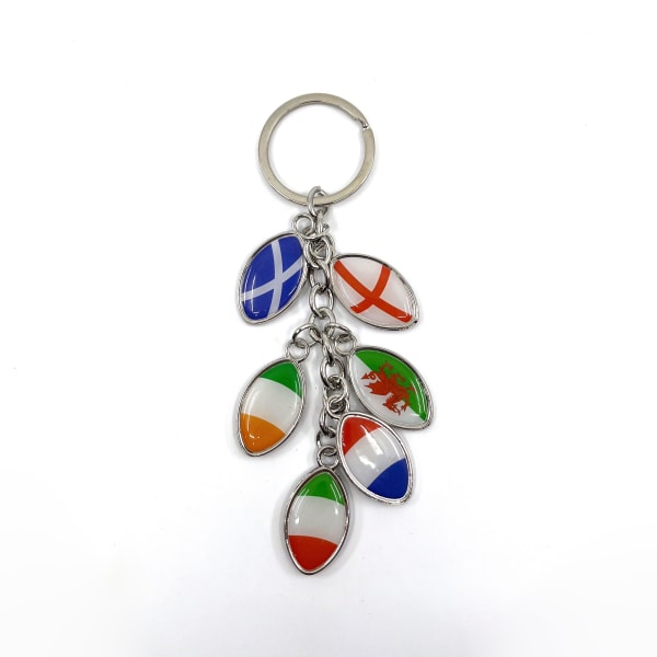 Our multi rugby keyring features 6 rugby balls designed with various British and Euopean flags.