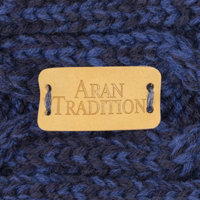 Chunky Cable knit snood from Aran Traditions. Traditional Aran multi cable and diamond design in soft cosy 3GG knit. Infinity style snood scarf. Pale tan leather brand logo hand stitched.