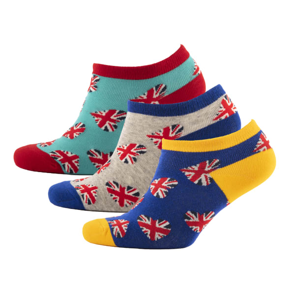 Our 3 Pack Union Jack Heart Socks includes an aqua, grey and blue pair. The socks also feature a contrast colour on heels, toes and rib tops.
