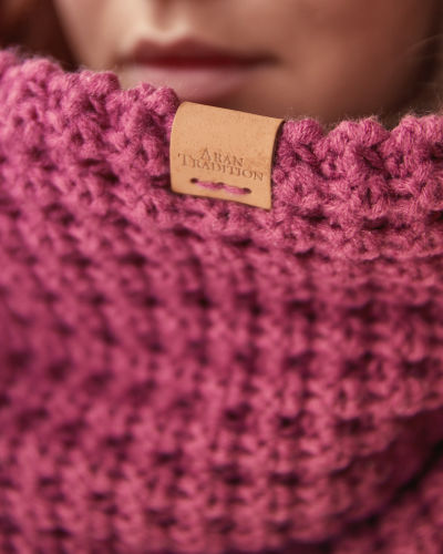 Our aran popcorn snood range features a popcorn knit with Pale tan leather brand logo hand stitched on the edge.
