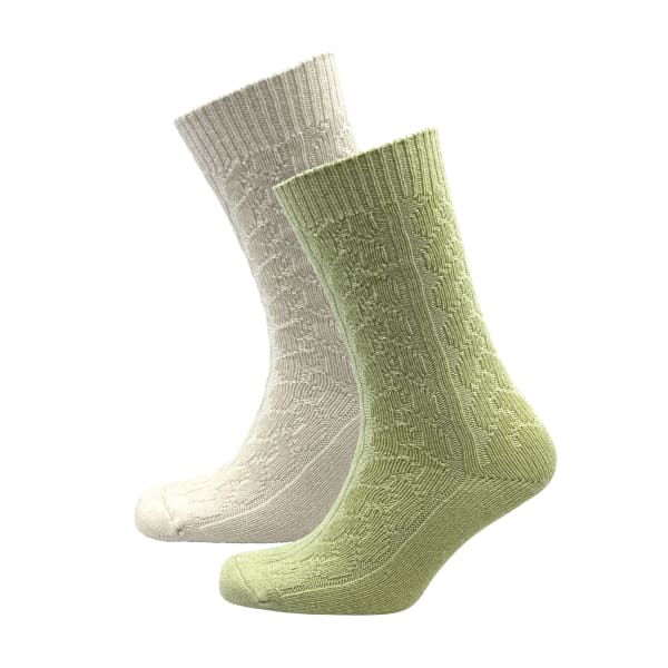 Aran Cable Cashmere Blend 2pk Socks -Winter Wht/Laurel Green