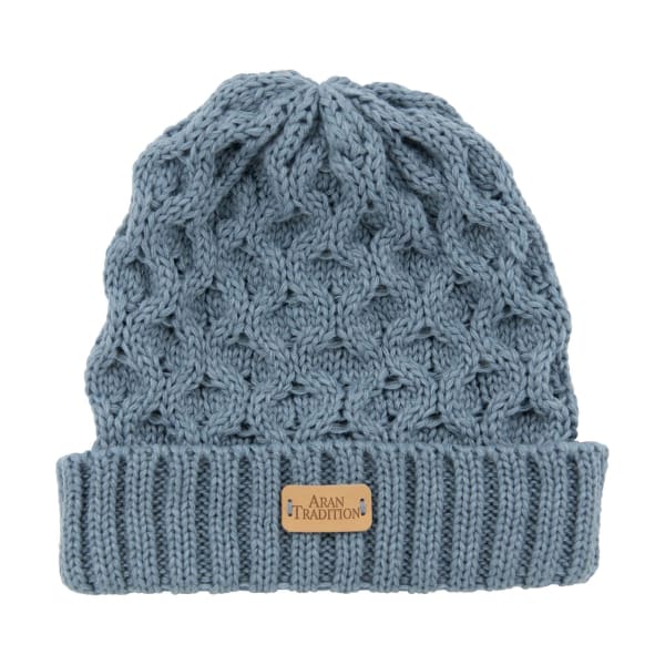 Chunky Cable knit beanie hat from Aran Traditions in soft cosy 5GG knit. Wide 2x2 Rib turn up hem for a comfortable flexible fit. Pale tan leather brand logo hand stitched on the front hem rib.