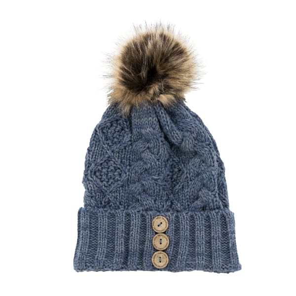 Aran Diamond Cable Button Hat - Denim Blue Mix / Natural