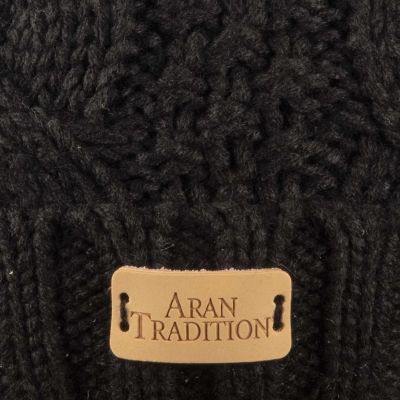 Traditional Aran cable design in soft cosy knit hat. Matching Faux Fur pom pom. Turn up wide rib edge for a cosy flexible fit. Pale tan leather brand logo hand stitched on the front hem rib.