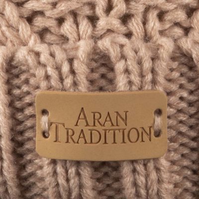 Traditional Aran cable design in soft cosy knit hat. Matching Faux Fur pom pom. Turn up wide rib edge for a cosy flexible fit. Pale tan leather brand logo hand stitched on the front hem rib.