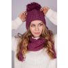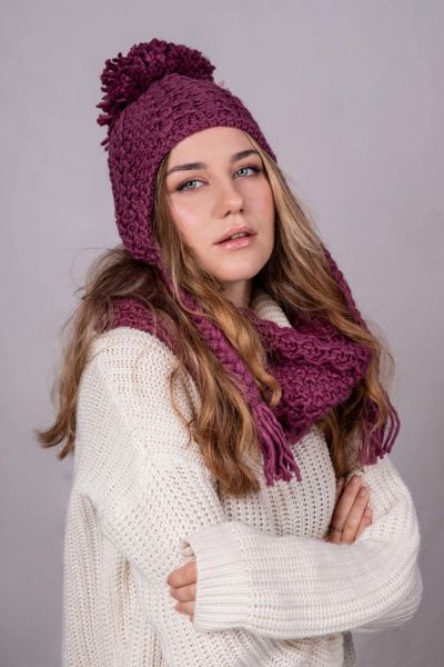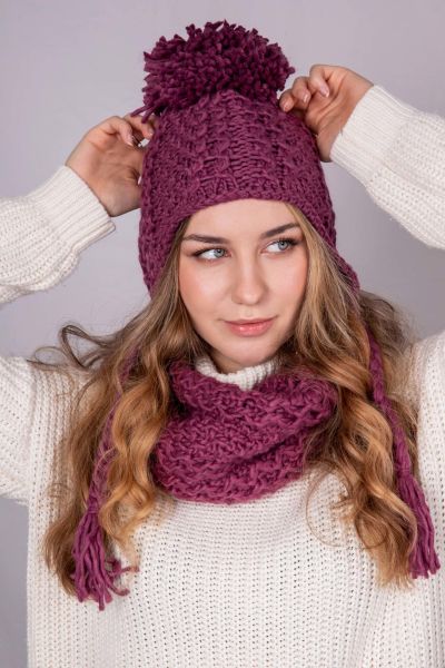 Aran Cable Braid Pom Pom Trapper - Mulberry