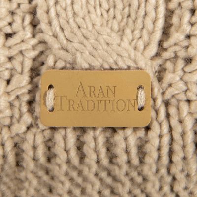Chunky Cable knit pom pom hat from Aran Traditions. Traditional Aran cable design in soft cosy 3GG knit. Natural coloured Faux Fur pom pom. Rib hem for a comfortable flexible fit. Pale tan leather brand logo hand stitched on the front hem rib.