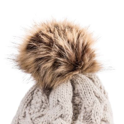 Traditional Diamond Cable design in soft cosy knit hat. Contrast colour Faux Fur Pom Pom gives a contemporary twist. Wide Rib Turn up hem with natural coconut button detail.