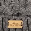 Chunky Cable knit beanie hat from Aran Traditions in soft cosy 5GG knit. Wide 2x2 Rib turn up hem for a comfortable flexible fit. Pale tan leather brand logo hand stitched on the front hem rib.