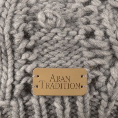 Chunky Cable Lace knit beret style hat from Aran Traditions. Beautifully crafted hand knit with open lace design and intricate bobble detail. Luxurious wool mix melange knit. 1x1 rib hem. Pale tan leather brand logo hand stitched on front edge.