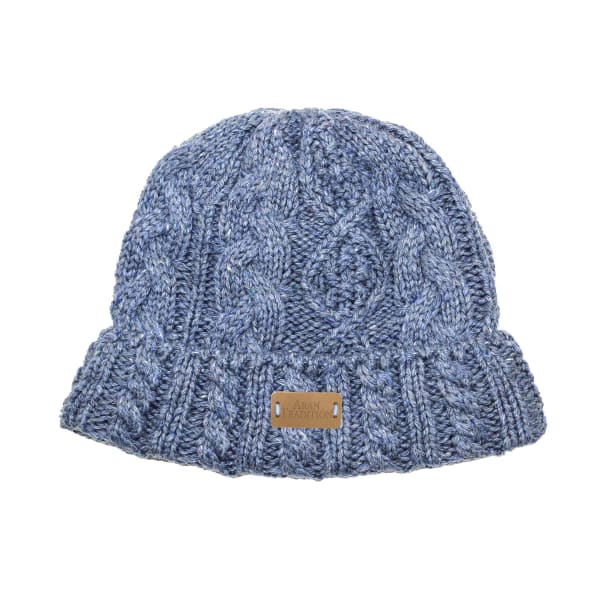 Cable knit headband with button fasten detail from Aran Workshop. Traditional Aran cable design in soft cosy 5GG knit. Dark tan leather brand logo hand stitched on hem edge.